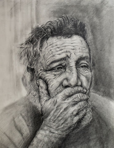 An elderly man covers his mouth in a moment of quiet reflection. The detailed rendering of his wrinkles and features emphasizes time, memory, and unspoken emotion. I focused on capturing the subtleties of texture and light to communicate stillness and dignity. The use of graphite pencils allows both this focus on detail while also emphasizing a nostalgic black and white effect. Despite the intricate details present in the center of the portraits, the elderly man appears to almost fade into his surroundings, inviting the audience to ask the question "where has the time gone?"