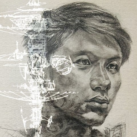 This portrait merges realistic drawing with digital schematics to explore the intersection of humanity and technology. I wanted to showcase how both structured systems and organic emotion coexist within identity. On a more personal level, this piece serves as reflection of the way different facets of my identity combine: what I felt was the more "mechanical" stem side and the more "organic" arts side.