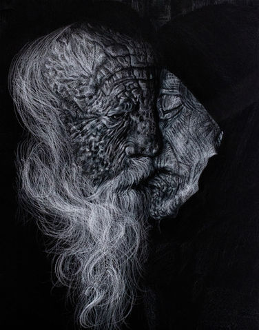 Drawn in white charcoal and graphite on black papers, this piece carves the image out of the darkness rather than receding into it. By using white materials, I am able to "draw the light", allowing the negative space to sit quiet and heavy around the couple, like the silence that two people share after a lifetime. The overlapping faces merge at the forehead and mouth as the couple coalesce in a kiss. I believe using white also helped exaggerate the appearance of age within the work: the highlights on the wrinkles, the eyelids and especially the beard. This piece is about the endurance of love, and how its strength keeps this elder couple bathed in light amongst the darkness.